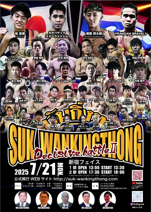 - ニュースムエタイ2025.07.04【スックワンキントーン】第2部メインでガオパヤックvs.須藤誇太朗のS・フェザー級タイトルマッチ、第1部メインは桂英慈vs.PRANDAM2025年7月21日(月・祝)東京・新宿FACE『スックワンキントーン Decisive battle II』の全対戦カードが発表された。今大会は昼夜の2部制(入れ替え制)で行われる。 第1部(開始13:30)のメインイベントは、54.5kg契約3分3Rで、桂英慈(クレイン)がPRANDAM BRAVELY(タイ/BRAVELY GYM)と対戦。 桂はWPMF世界2階級制覇王者・一戸総太の愛