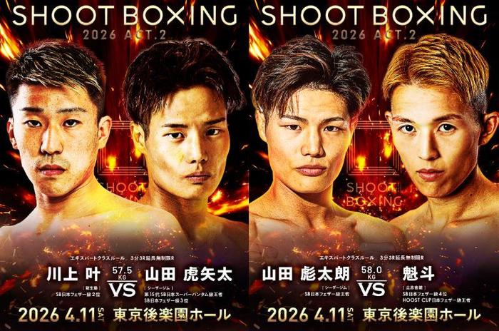 - ニュースシュートボクシング2026.02.24【シュートボクシング】フェザー級上位4人が激突=川上叶vs.山田虎矢太、山田彪太朗vs.魁斗。山口裕人がOFGマッチで参戦、手塚翔太vs.基山幹太が仕切り直しのライト級王座決定戦2026年4月11日(土)東京・後楽園ホール『SHOOT BOXING 2026 act.2』(U-NEXT配信)の第一弾対戦カードが発表された。 昨年11月の創設40周年記念興行では初めてフェザー級(58kg)で『シュートボクシング世界トーナメント S-cup』が開催され、世界4カ国から6団体の王者が参戦。RISEフェザー級王者の安本晴翔が1回戦で川上叶、準決勝で山田虎矢太、決勝で山田彪太朗