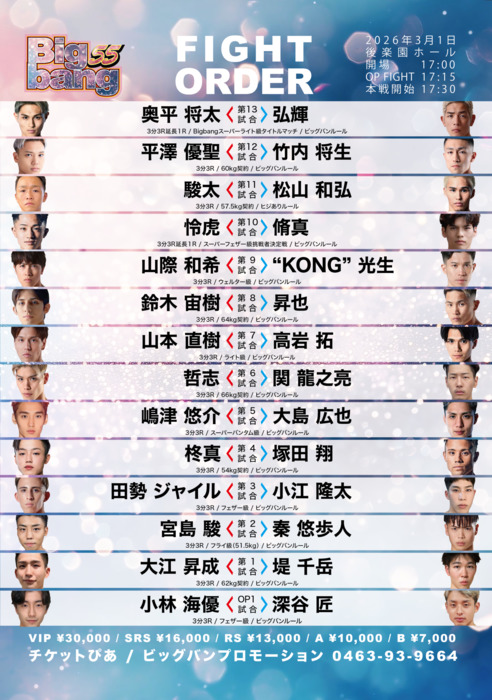 - ニュースキックボクシング2026.01.11【ビッグバン】スーパーライト級王座戦で奥平将太vs.弘輝、山際和希は“KONG”光生と対戦、“意外な選手”の参戦も予告2026年3月1日(日)東京・後楽園ホール『ビッグバン・統一への道 其の55』の主要対戦カードが発表された。 今大会のメインイベントはスーパーライト級タイトルマッチ3分3R延長1R、同級王者の奥平将太(KSR GYM)に“喧嘩王”弘輝(WORLD TREE GYM)が挑戦する。 奥平はビッグバンアマチュア大会6階級を制し、RISEで活躍。25年3月にビッグバン初参戦、ノンタイトル戦で王者・琢磨を