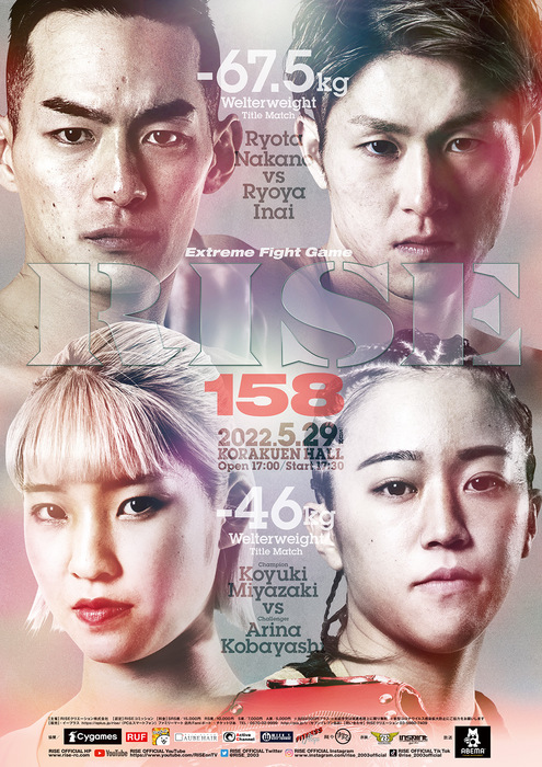 - ニュースキックボクシング2022.04.21【RISE】宮﨑小雪と小林愛理奈がタイトルマッチで3度目の対戦、中野椋太vs無敗・稲井良弥でウェルター級王座決定戦、「ベイベ」チャッピー吉沼が濃いキャラ対決2022年5月29日(日)東京・後楽園ホール『RISE 158』の主要対戦カードが発表された。 RISE QUEENアトム級(-46kg)タイトルマッチ3分5R無制限延長Rで、王者・宮﨑小雪(TRY HARD GYM)が同級1位・小林愛理奈(FASCINATE FIGHT TEAM)の挑戦を受けての初防衛戦を行う。 宮﨑は“宮﨑姉妹”の妹で、小学3年生から空手を学び、2019年8月のKAMI