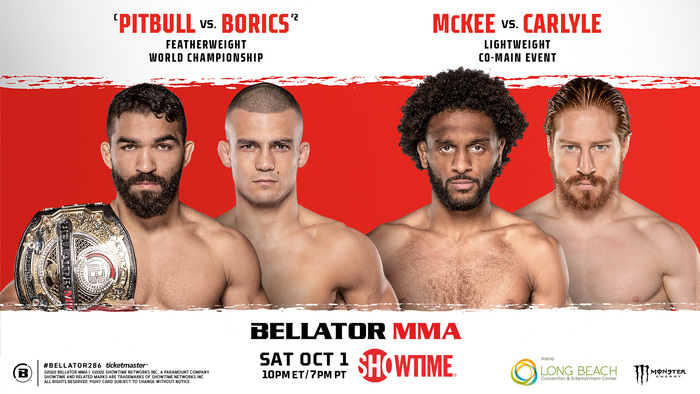 - ニュースMMA2022.08.04【Bellator】フェザー級王者パトリシオ“ピットブル”vs.挑戦者アダム・ボリッチ、ライト級初戦 AJ・マッキーの相手は、RIZINで武田を極めたスパイク・カーライル!=10.1『Bellator 286』2022年10月1日(日本時間2日・U-NEXT配信)、米国カリフォルニア州ロングビーチのロングビーチアリーナにて、『Bellator 286: Pitbull vs. Borics』の開催が決定。 メインイベントで、現Bellator世界フェザー級王者パトリシオ“ピットブル”・フレイレ(ブラジル)と、同級2位のアダム・ボリッチ(ハンガリー)のBellator世界フェザー級タイトルマッチ(5分
