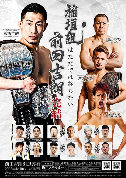 - ニュースMMA2022.02.24PANCRASE&DEEP二冠王者・前田吉朗が引退=4月10日(日)思い出の梅田ステラホールで引退興行PANCRASE、DEEPのタイトルを獲得し、常に日本軽量級の最前線で闘ってきた前田吉朗(パンクラス大阪稲垣組/ENCOUNTER)が2022年4月10日、若手時代の思い出の会場「梅田ステラホール」において引退試合を行うことが決定した。 「引退エキシビションマッチ」は数試合行われる予定で、その第一弾として、前田吉朗から稲垣組魂を継承された後輩・北方大地とのエキシビションマッチが決定している。