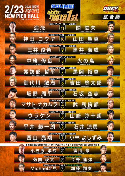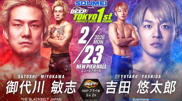 - ニュースMMA2025.12.27【DEEP】ライト級・神田コウヤvs.山田聖真、フェザー級で海飛vs.関鉄矢のストライカー対決、三井俊希vs.黒井海成、フライ級・斎藤璃貴vs.御代川敏志、中務修良、山崎弥十朗も出場=2月23日(月・祝)ニューピア2026年2月23日(月・祝)、東京・ニューピアホールにて、昼大会『SOUMEI Presents DEEP TOKYO IMPACT 2026 1st ROUND』と、夜大会『DAYS Presents DEEP JEWELS 52』の開催が決定。下記カードが発表された。 DEEP TOKYO IMPACT 2026 1st ROUND 決定カード ▼DEEPライト級 5分3R神田コウヤ(TH