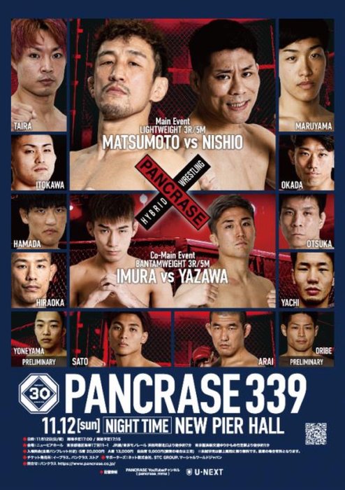 - ニュースMMA2023.10.13【PANCRASE】昼夜興行のカード振り分け発表、夜の部で松本光史vs.西尾真輔、井村塁vs.矢澤諒、昼の部で三宅輝砂vs.櫻井裕康、名田英平vs.キム・サンウォンなど=11月12日(日)ニューピア2023年11月12日(日)東京竹芝のニューピアホールで開催される昼大会「PANCRASE 338」と夜大会「PANCRASE 339」のカード振り分けが発表された(※選手名から見どころ)。 PANCRASE 339 カード 11月12日(日/夜)ニューピアホール開場予定17:00/開始予定17:15 ▼ライト級 5分3R松本光史(M PLATIC)23勝12敗2分 #4位/修斗・第12代世界ラ