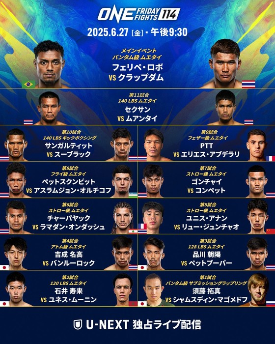 - ニュースムエタイ2025.06.25【ONE FF】吉成名高出場の『ONE Friday Fights 114』は豪華ラインナップ、元WBAアジア王者のサンガルティット、セクサン、ムアンタイ、コンペットが出場2025年6月27日(金)タイ・ルンピニースタジアム『ONE Friday Fights 114』(U-NEXT配信)は、吉成名高(エイワスポーツジム)、品川朝陽(同)、石井寿来(ウォーワンチャイプロモーション)、須藤拓真(X-TREME EBINA)と4人の日本人選手が出場することで注目を集めているが、その他のカードも豪華なラインナップとなっている。 メインイベントはキャッチウェイト (-6