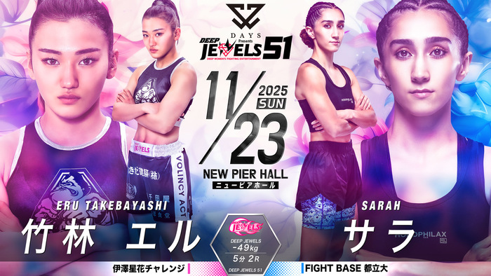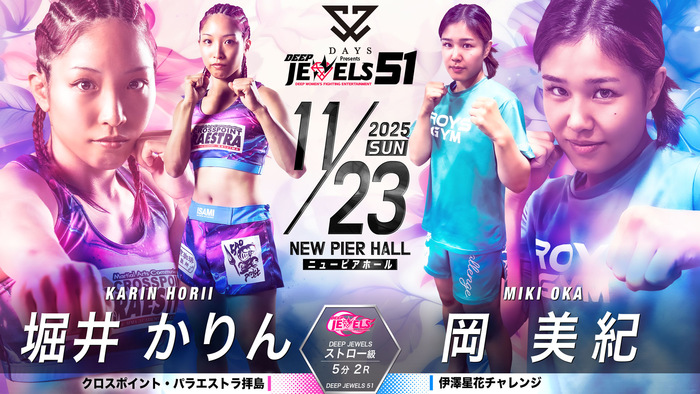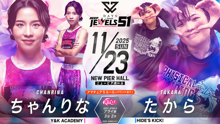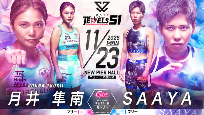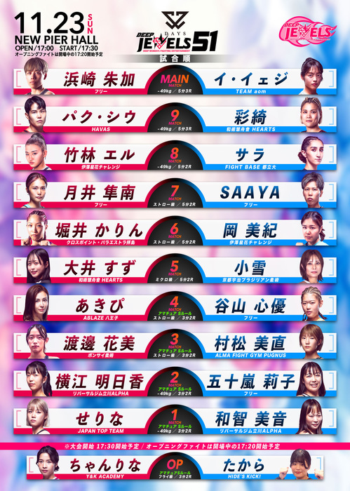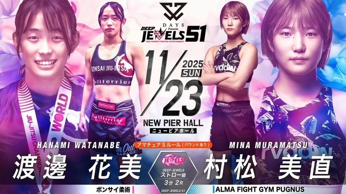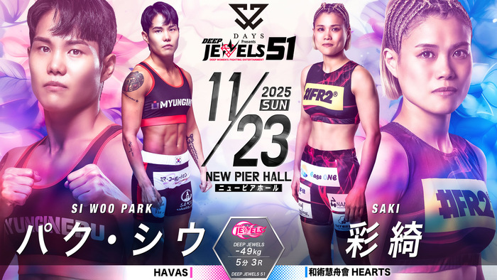 - ニュースMMA2025.10.01【DEEP JEWELS】浜崎朱加が再起戦で大島沙緒里破ったイ・イェジと対戦、パク・シウがスーパーアトム級で彩綺と激突。重田ホノカが期待の新人・ののかを迎え撃つ=11月23日(日)ニューピア・11カード発表2025年11月23日(日)東京・ニューピアホールにて『DAYS Presents DEEP JEWELS 51』の開催が決定。11カードが発表された。 ▼DEEP JEWELS 49kg以下 5分3R浜崎朱加(フリー) イ・イェジ(TEAM aom) 25年3月に須田萌里に一本負けした浜崎朱加(フリー) が再起戦。5月に大島沙緒里にアトム級で判定勝ちしたイ・イェジ(韓国/TEAM aom