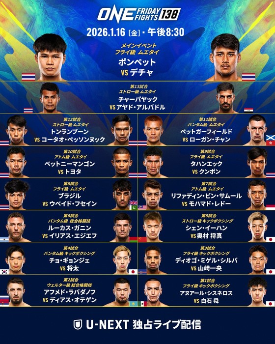 2026年1月16日(金)タイ・ルンピニースタジアムで今年初の開催となる『ONE Friday Fights 138』(U-NEXT配信)に、RISEから日本人4選手が揃って参戦する。