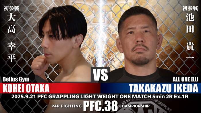 大高は、「今回『PFC38』に初参戦させて頂きます、BellusGymの大高です。この度はグラップリングマッチを組んで頂きありがとうございます。グラップリングの試合自体は初めてですが、臆する事なく自分の持ち味を発揮して一本を狙うスタイルでリングの上に立ちたいと思います! また機会があれば本来の自分の土俵のMMAにも参戦したい意気込みがありますので宜しくお願い致します」と、グラップリングのみならず、MMAでも参戦を希望。
