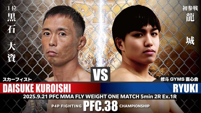 龍城「今回初めてPFCに出場します! 絶対に負けないし、勝つのは当然で、面白い試合運びをしたいと思います! 目指すところは高いですが、無敗のまま勝ち上がって行くつもりです! 今回の試合で一番強く、面白く、カッコよく勝利したいと思います! 主催者の方は生まれは門真なんですね! それなら僕が地元の後輩としてしっかりKOですね!」