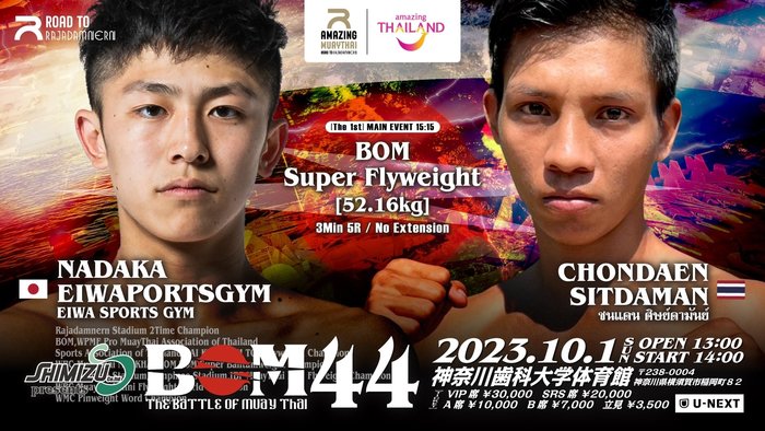- ニュースムエタイ2023.09.26【BOM】吉成名高がラジャ3階級制覇を目指してスーパーフライ級戦、朝陽はファイタータイプのタイ人と対戦、ラジャダムナン興行への出場権を懸けた査定試合も2023年10月1日(日)神奈川・横須賀市にある神奈川歯科大学体育館にて開催される『Amazing Muaythai,Road to Rajadamnern × Shimizu presents BOM 44』の全対戦カードが決定した。 今大会にはラジャダムナンスタジアム認定フライ級王者の名高・エイワスポーツジム(=吉成名高/エイワスポーツジム)が出場。8月12日のルンウィタヤー戦(4R TK