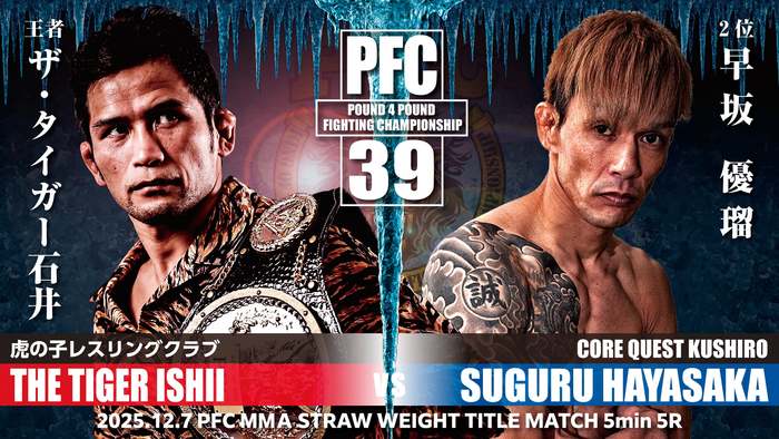 早坂「12月7日 PFC39でタイトルマッチが決まりました。相手は王者・ザ・タイガー石井選手。自分にとってリベンジ戦です。タイガーさんは本当に尊敬している選手です。だからこそ、この舞台で再び戦えるのは嬉しい。でも、仲良しこよしをする気はありません。リングに上がれば容赦なく勝ちにいきます成長した姿を見せて、必ずベルトを釧路に持ち帰ります。応援よろしくお願いします」