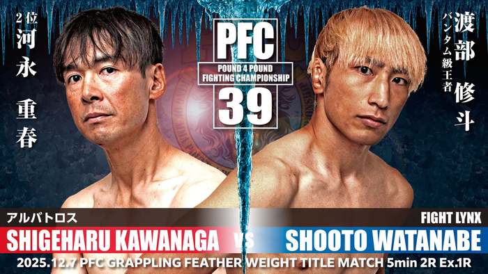 渡部「PFC年内最終戦、今回はGRAPPLINGフェザー級王座決定戦で参戦させていただくことになりまた。やはり自分がPFCのGRAPPLING部門を盛り上げて引っ張っていかないと使命感があります。当初は中里選手との対戦予定でしたがタイミング合わず、河永選手が自分と試合したいと希望いただき自分もその気持ちがとても嬉しく、北海道であとどれくらいやれるか分からないなか対戦を希望してくれる選手の気持ちに応えたいと思い今回の試合決定となりました。ベテランで戦績もある選手なので胸を借りるつもりで精一杯挑ませてもらい、そして勝ってGRAPPLING初の二階級王者になって更に盛り上げていけたらと思います。応援よろしくお願いします!」
