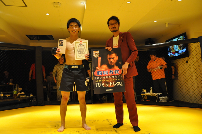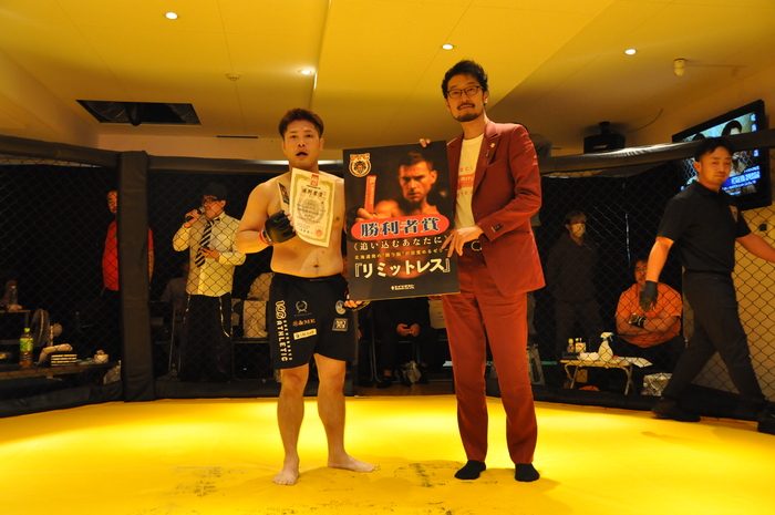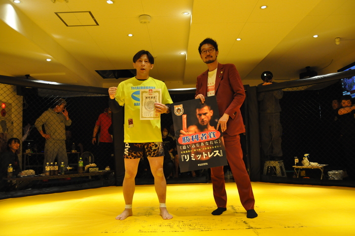 佐藤は長いリーチを活かしたパンチ、ローキック、後ろ回し蹴り、ハイキックを入れ、最後に飛び膝蹴りでレジェンド竹内を完全KOに下した!双方戦った本人も、来場した全てのお客さんもビックリのサプライズエンディングをやってのけた。試合後、竹内はMMA引退を表明、勝った佐藤は嬉し泣き、プロ2勝目、連敗を脱出した。