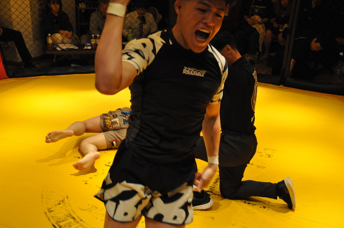 試合は開始早々下になる池田、動き方がザ・柔術家らしい動きで、下から引き込もうとするも大高はそれを上から冷静に対処し引き込まれず、ペースを握らせない。引き込めないと見た池田、今度は自ら上に成ろうと展開を変える。その時を見計らったかのように大高が あれよ あれよと池田の足を捕獲しヒールフックで捉え池田はタップ、勝負有り!勝った大高のマイクではプランには無かったが日頃やってた動きが自然に出たとコメント。負けた池田はあの展開は一番苦手な展開とコメント。セミファイナルに抜擢された注目のグラップリング戦は、紫帯大高が黒帯の池田を倒し、思いも寄らない短期決戦の結末となった! プログラップリング戦は、今後益々盛り上がりそうな気配だ。