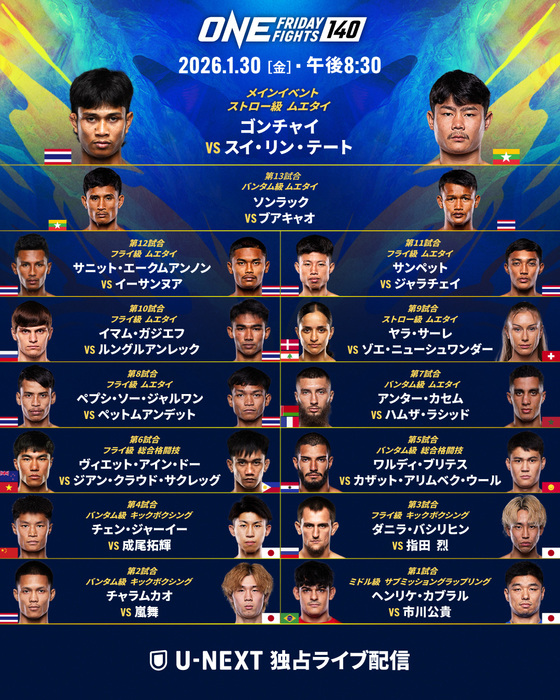 2026年1月30日(金)タイ・ルンピニースタジアム『ONE Friday Fights 140』(U-NEXT配信)に、今週も日本人4選手が出場する。