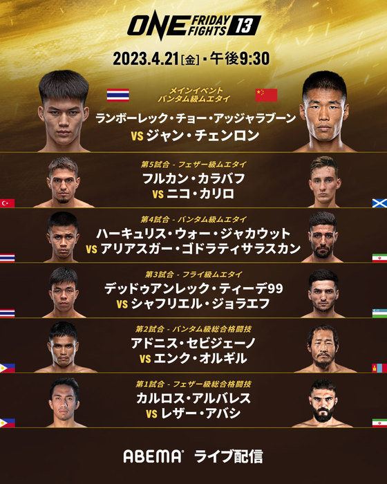 さらに、元ONE世界タイトル挑戦者のジャン・チェンロンや、「ONEウォリアーシリーズ」のフィリピンの勝者のアドニス・セビジェーノ、ストロー級ムエタイ2位コンテンダーのアスランベック・ジクレーブも出場する。
