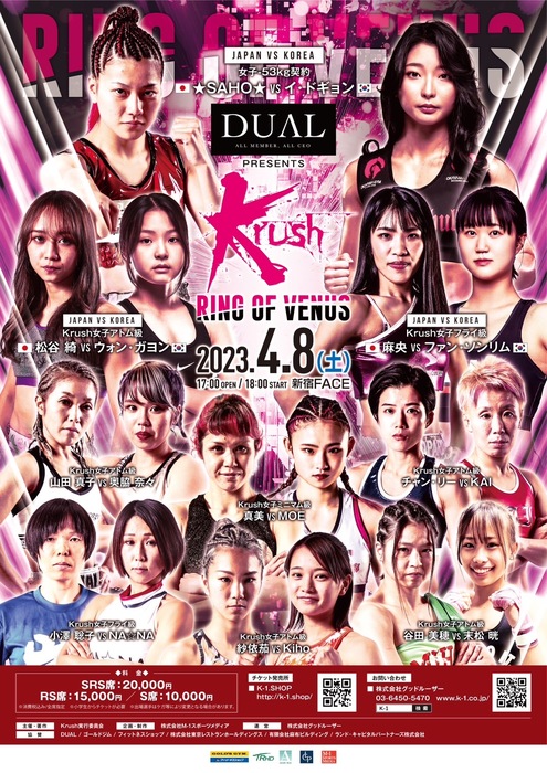 - ニュースK-12023.03.18【Krush】初の女子限定大会全カード決定、日本vs.韓国に☆SAHO☆、麻央、松谷綺。山田真子、チャン・リーらも出場2023年4月8日(土)東京・新宿FACEで開催される『Krush ~RING OF VENUS~』の全対戦カードが発表された。 『Krush ~RING OF VENUS~』は全試合が女子選手による“Krush初の女子大会”で、今大会では「日本vs韓国・3対3」が決定。 ▼日本vs韓国・3対3 女子-53kg契約 3分3R延長1R☆SAHO☆(闘神塾/S1レディース世界バンタム級王者、S1レデ