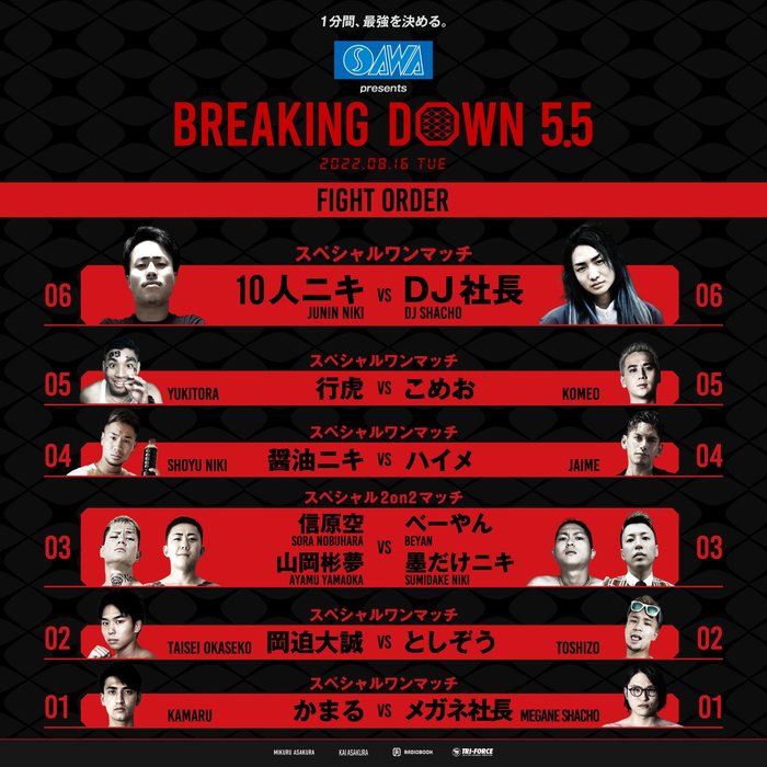 11月3日に「BreakingDown6」が決定済みで出場選手募集をかけているさなかに決まった「BreakingDown5.5」は、7月に開催された「BreakingDown5」のスピンオフ企画で、朝倉未来のYouTubeチャンネルにて無料配信される。