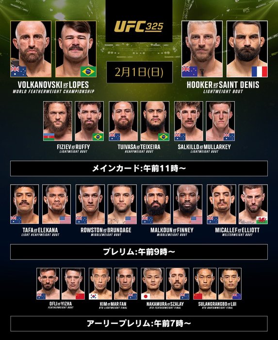 2026年1月31日(日本時間2月1日)に豪州シドニーのクドス・バンク・アリーナで『UFC 325: Volkanovski vs. Lopes 2』(U-NEXT配信)が開催。メインイベントで「UFC世界フェザー級選手権試合」(5分5R)王者アレクサンダー・ヴォルカノフスキー(豪州)に、ディエゴ・ロペス(ブラジル)が挑戦することが発表された。