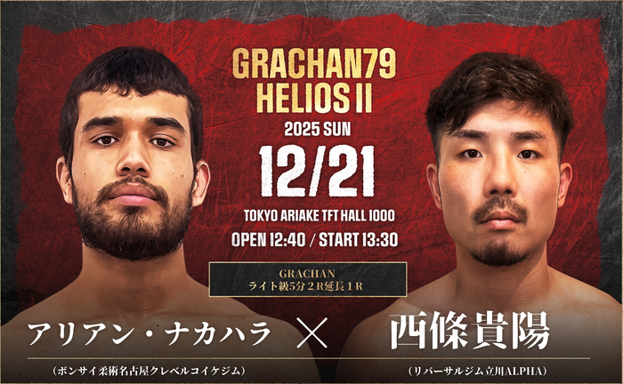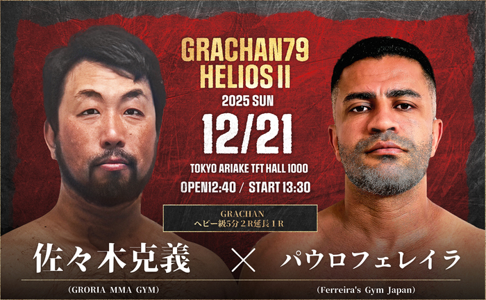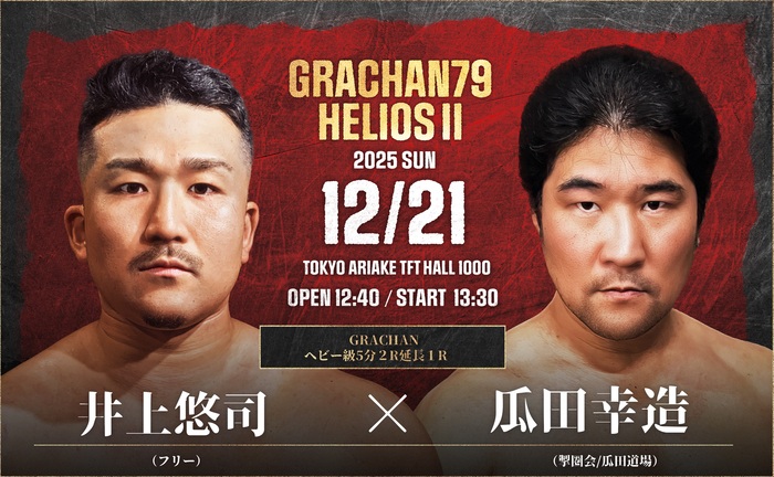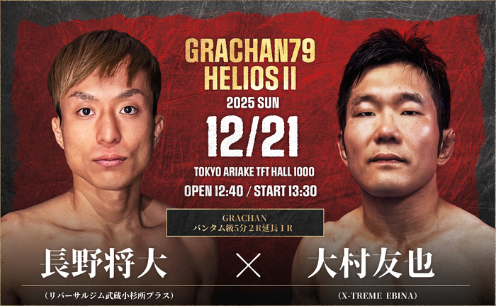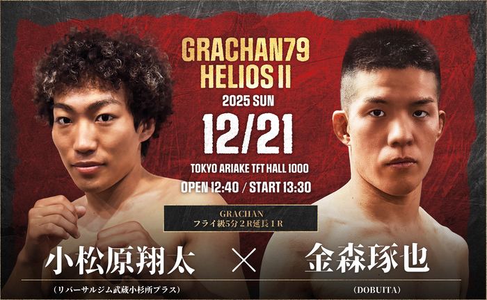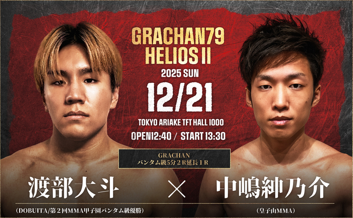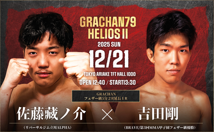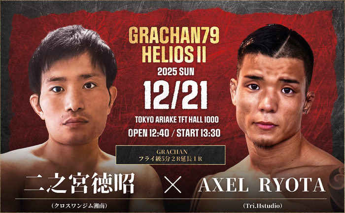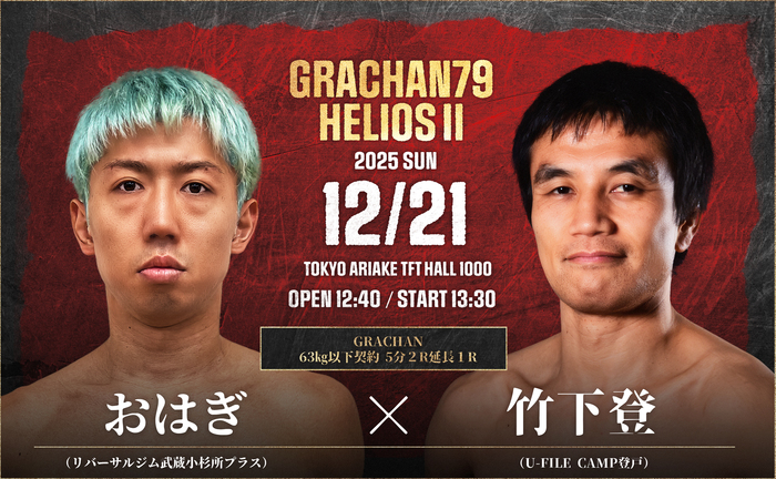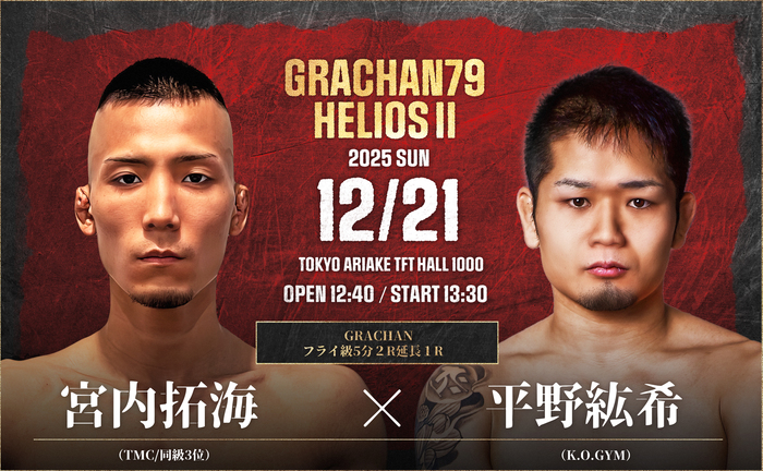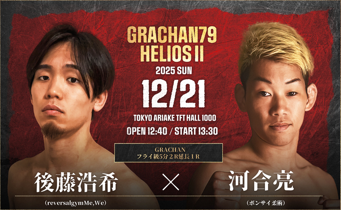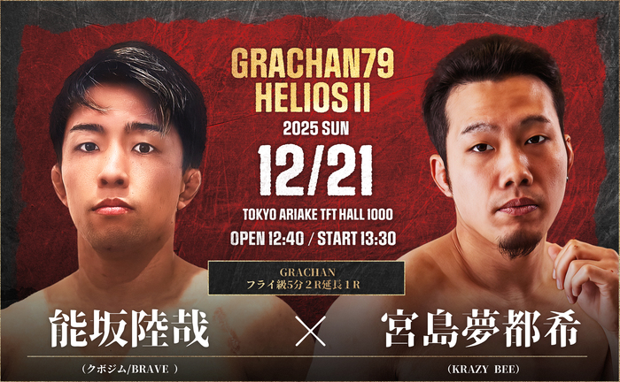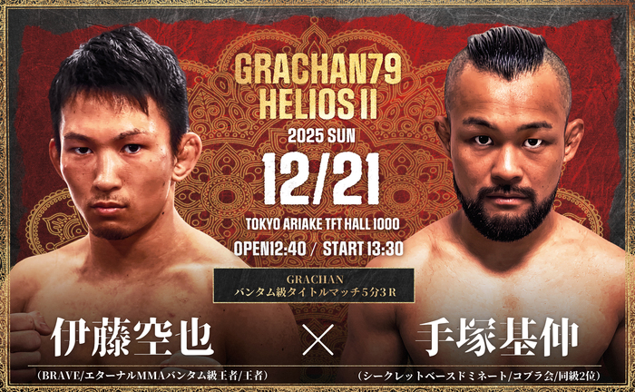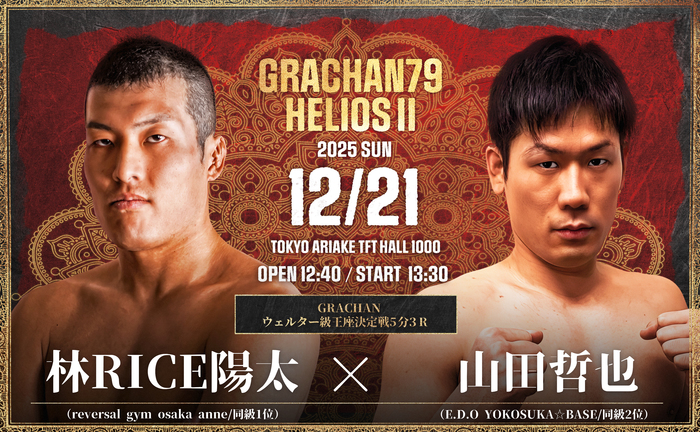 今大会は、バンタム級王者・伊藤空也が、かつて自身からベルトを奪った手塚基伸と再び激突する「宿命のリマッチ」。そして、ウェルター級王者の桜井隆多が契約期間内に試合できない事から王座返上。元ライト級王者・林“RICE”陽太が二階級制覇を懸けて挑む「ウェルター級王座決定戦」と、二大タイトルマッチが並ぶ、GRACHAN年末の頂上決戦となった(『GRACHAN79』13:30開始、『HELIOSⅡ』17:00開始予定)。