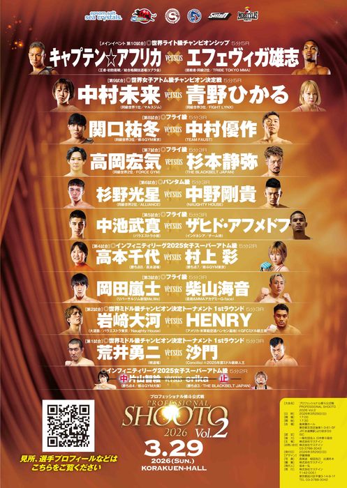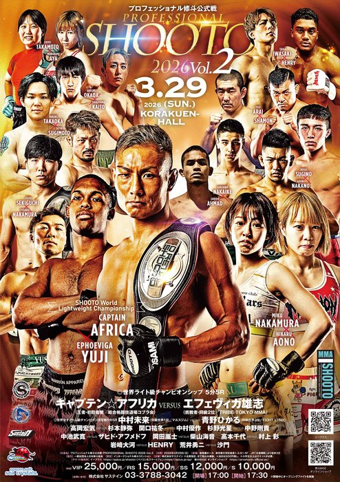 まずはライト級世界王者キャプテン☆アフリカ(総合格闘技道場コブラ会)の初防衛戦が決定。2024年7月28日に大尊伸光を破り、第15代世界王座戴冠後は、連戦となった8月の『ROAD FC69』でパク・シウォンに1R TKO負け、25年7月の『Ultimate Shooting』で1R KO勝ち後、25年11月の『RIZIN LANDMARK 12』でキ・ウォンビンに判定負けと、他団体で試合を行ってきたキャプテンが修斗に返ってくる。