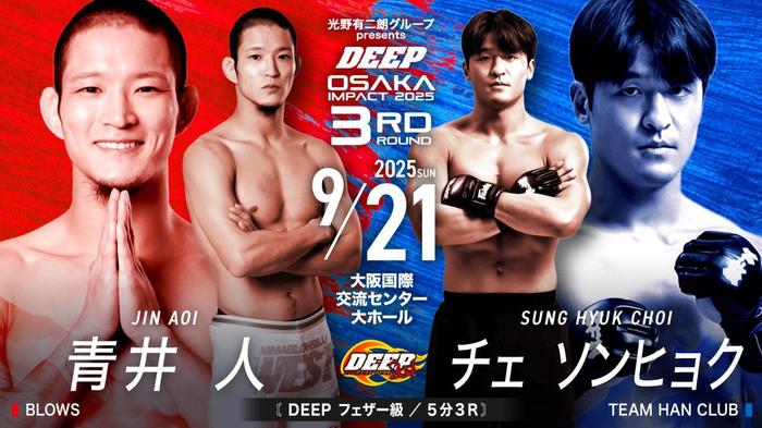 - ニュースMMA2025.08.05【DEEP】大阪昼大会で『ROAD TO UFC』敗戦から再起のフェザー級王者・青井人がコリアンゾンビZFNのチェ・ソンヒョクと対戦、夜大会でウェルター級王者・角野晃平vs.挑戦者・嶋田伊吹、バンタム級で小崎連vs.前園渓も=9月21日(日)2025年9月21日(日)大阪国際交流センター大ホールにて『DEEP OSAKA IMPACT 2025』(DEEP YouTubeメンバーシップ)の昼夜大会の開催が決定。昼『3nd ROUND』で10カード、夜『4th ROUND』で7カードが発表された。 【3nd ROUND】(昼大会) ▼DEEPフェザー級 5分3R 青井 人 (BLOWS)14勝6敗1分チェ・ソンヒョク (TEAM HA