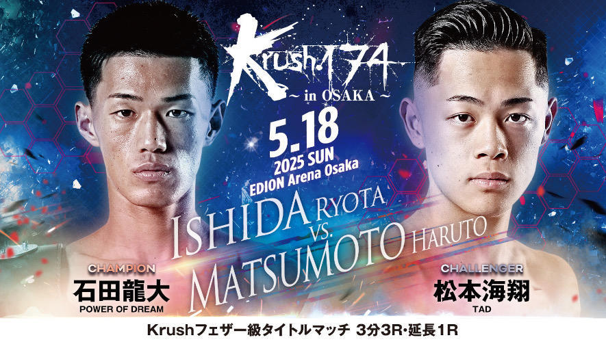 2019年11月16日の『Krush.108』住吉スポーツセンター大会以来、5年半ぶり2度めの開催となるKrushの大阪大会が、2025年5月18日(日)大阪府立体育会館・第2競技場(エディオンアリーナ大阪)にて『Krush.174/175 ~in OSAKA~』の昼・夜2大会制で行われる。 【写真】昼の部のメインはフェザー級タイトルマッチの石田vs.松本 昼夜合わせて全20試合が3月31日に発
