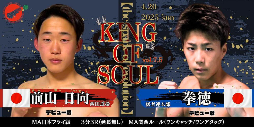2025年4月20日(日)大阪・世界館にて開催されるMA日本キックボクシング連盟公認大会『KING OF SOUL:vol.7.5【the spark of evolution】』の全対戦カードが発表された。  今大会はMA日本キックの本シリーズ『KING OF SOUL』のサブ大会となり、新人やこれからの活躍が期待される選手たちをメインにした登竜門大会となる。  メインイベントでは、MA日本フ