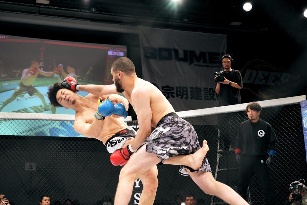 DEEP フューチャーキングトーナメント 20242025年4月13日(日)東京・ニューピアホール ▼第79試合 ウェルター級(77.1kg以下)決勝戦 5分2R〇大澤将司(BLOWS)[1R 4分57秒 TKO]×羽江哲郎(CAVE)  1R、右ローを見舞う大澤、羽江はパンチのフェイントから組みに行くが大澤がヒザを合わせる。スタンドに戻った両者、大澤がジャブから右アッパー、後ろ廻し蹴りも見せる。