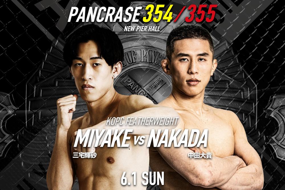 2025年6月1日(日)東京・ニューピアホールで昼夜大会で開催される『PANCRASE 354/355』のカードが発表された。  フェザー級の「キング オブ パンクラス チャンピオンシップ」(5分5R)として、王者・三宅輝砂(ZOOMER)に、中田大貴(和術慧舟會HEARTS)が挑戦する。 王者・三宅に一本勝ちしている中田がベルトに挑戦 ▼PANCRASEフェザー級タイトルマッチ 5分5R三宅輝