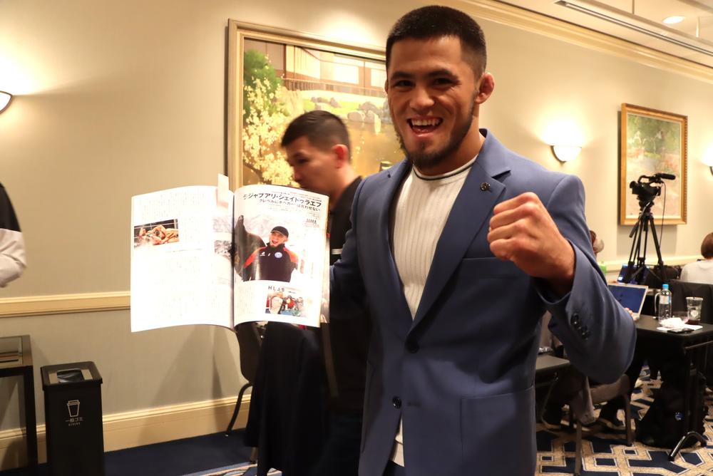 2025年5月4日(日)東京ドーム『RIZIN男祭り』に出場する全選手の個別インタビューが、2日(金)都内にて行われた。 メインイベント(第16試合)のRIZINフェザー級タイトルマッチ5分3Rで、王者クレベル・コイケ(ボンサイ柔術)に挑戦するラジャブアリ・シェイドゥラエフ(キルギス)が出席。試合への意気込みを語った。 キルギスでチームを越えてともに練習することもある ──ブルーのスーツですが、