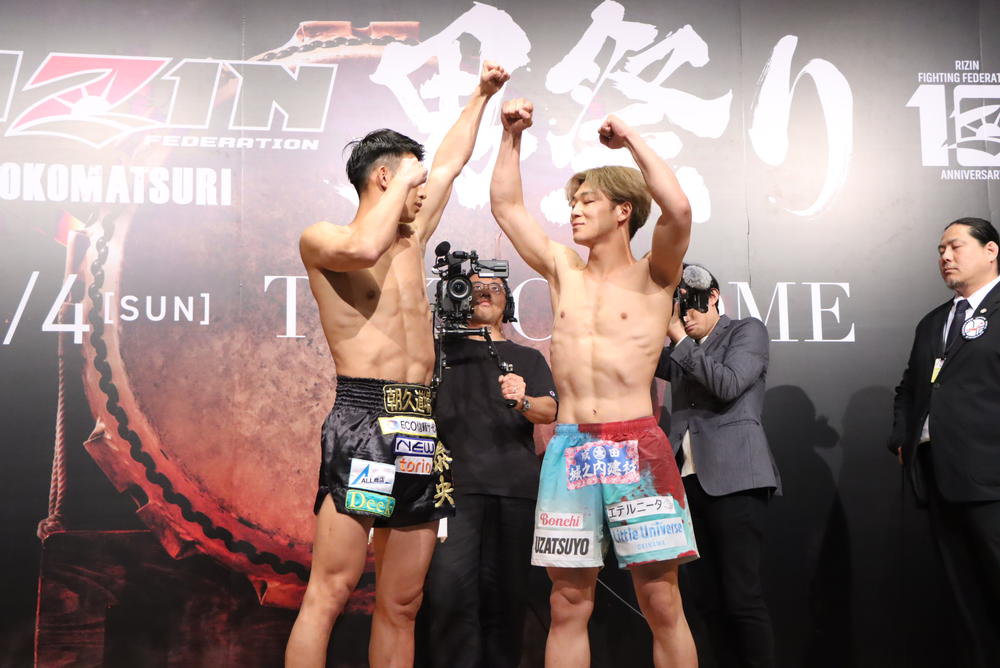 第7試合のRIZINライト級(71.0kg)5分3Rで対戦する、中村大介(夕月堂本舗)は70.95kg、桜庭大世(サクラバファミリア)は70.45kgでそれぞれ計量をパス。
