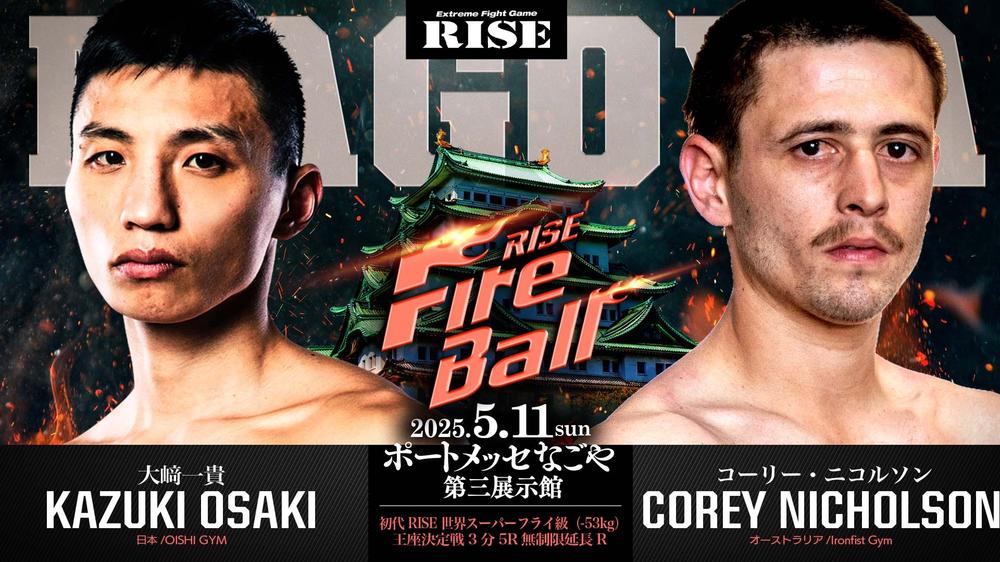 2025年5月11日(日)愛知・ポートメッセなごや第三展示館で開催されるRISE初の名古屋大会『RISE Fire Ball NAGOYA』にて、初代RISE世界スーパーフライ級(-53kg)王座決定戦3分5R無制限延長RでWBCムエタイ世界バンタム級&スーパーバンタム級王者コーリー・ニコルソン(オーストラリア/Ironfist Gym)と対戦する大﨑一貴(OISHI GYMのインタビューが主催