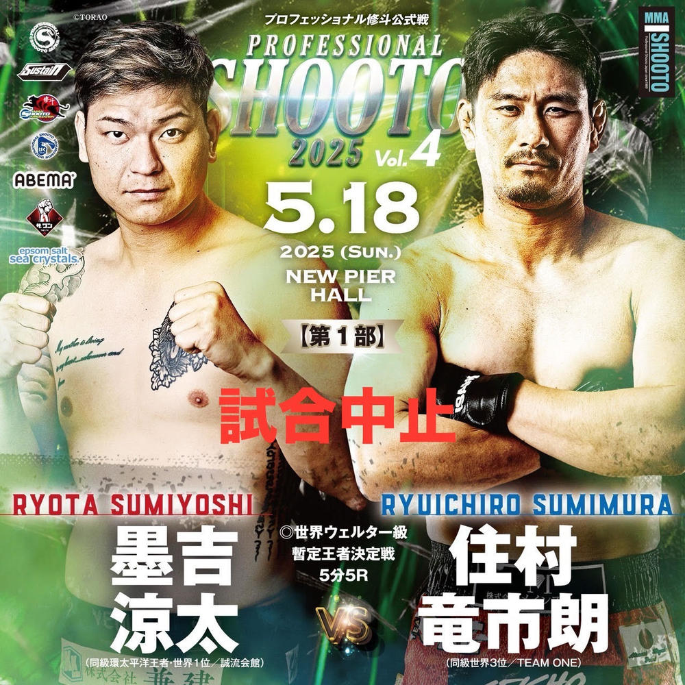 2025年5月18日(日)東京・ニューピアホール昼夜大会『PROFESSIONAL SHOOTO 2025 Vol.3 & Vol.4』の両大会メインイベントで行われる予定だった世界タイトル戦が2試合中止となった。