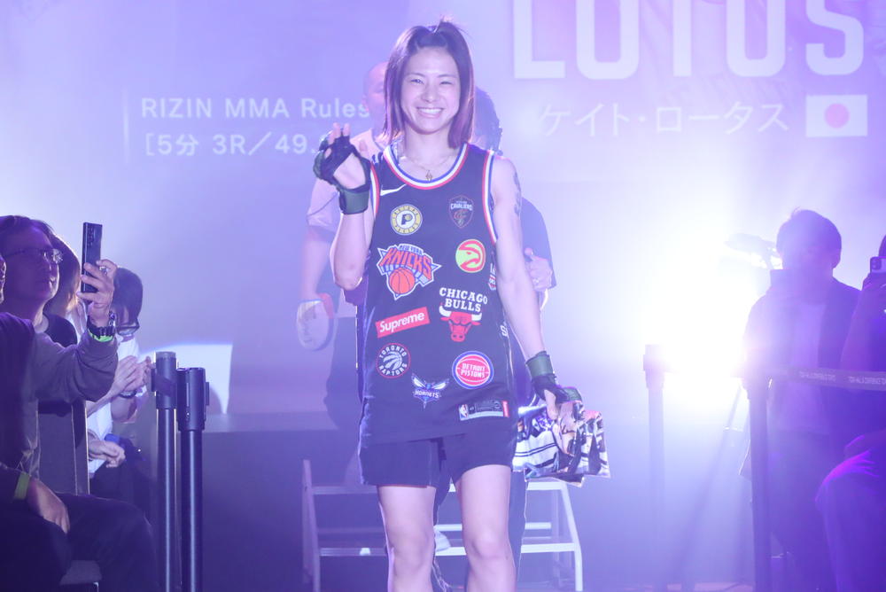 RIZINスーパーアトム級(49.0kg)5分3Rで、シン・ユリ(韓国/team GENIUS)と対戦するケイト・ロータス(フリー)は笑顔で登場すると1分30秒間のミット打ち。ジャブ、ワンツーから左ストレート、左フッ