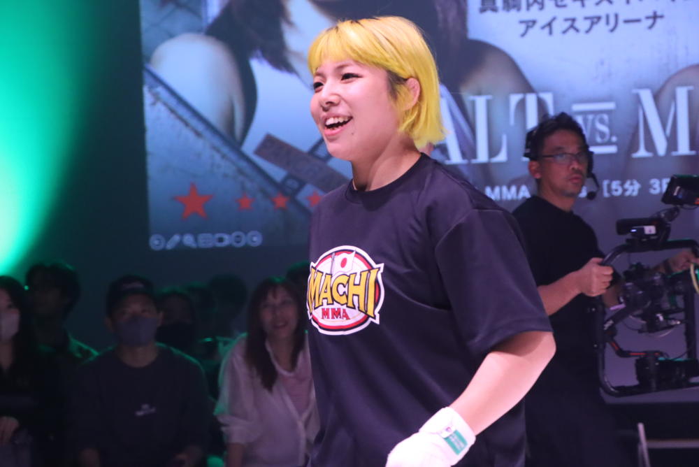 RIZINストロー級(52.50kg)5分3Rで、PANCRASEストロー級王者ソルト(マルスジム)と対戦する万智(67ジム)はファンに笑顔を振り撒いて明るく登場。