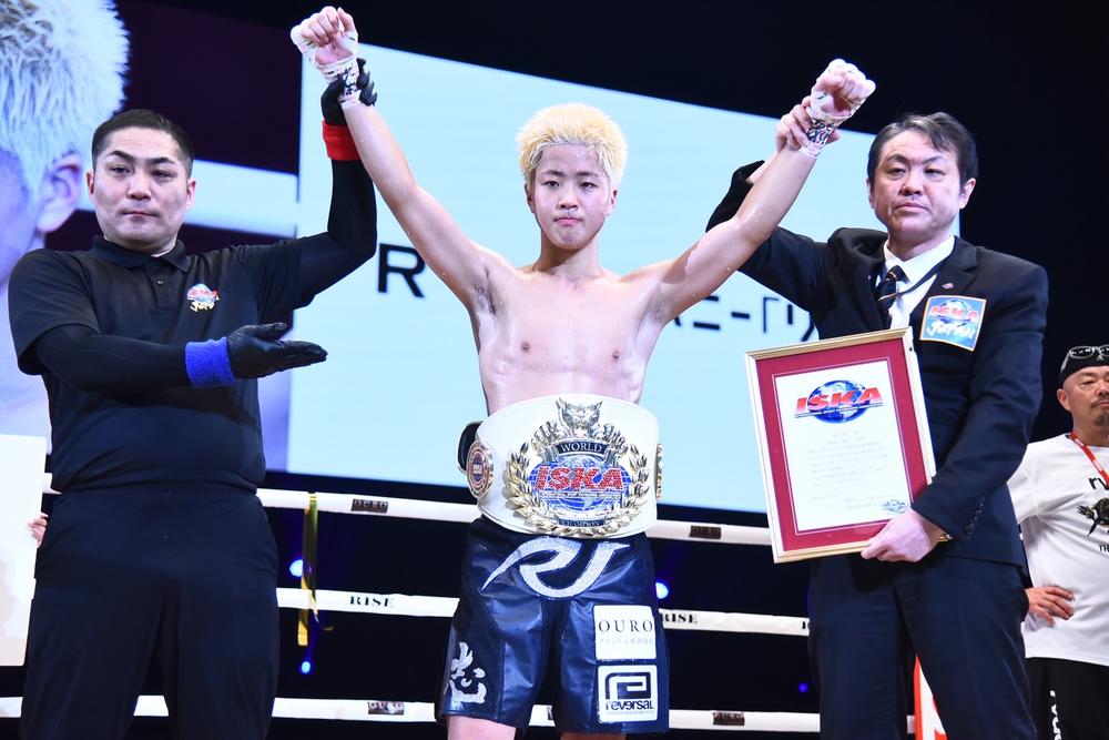 2025年6月21日(土)神奈川・横浜BUNTAIで開催された『RISE WORLD SERIES 2025』のメインイベントにて、ハマダ・アズマニ(モロッコ/アルティメットファイトスクール)を判定3-0で破りISKA K-1ルール世界ストロー級(-51.5kg)王者となった那須川龍心(TEAM TEPPEN)。