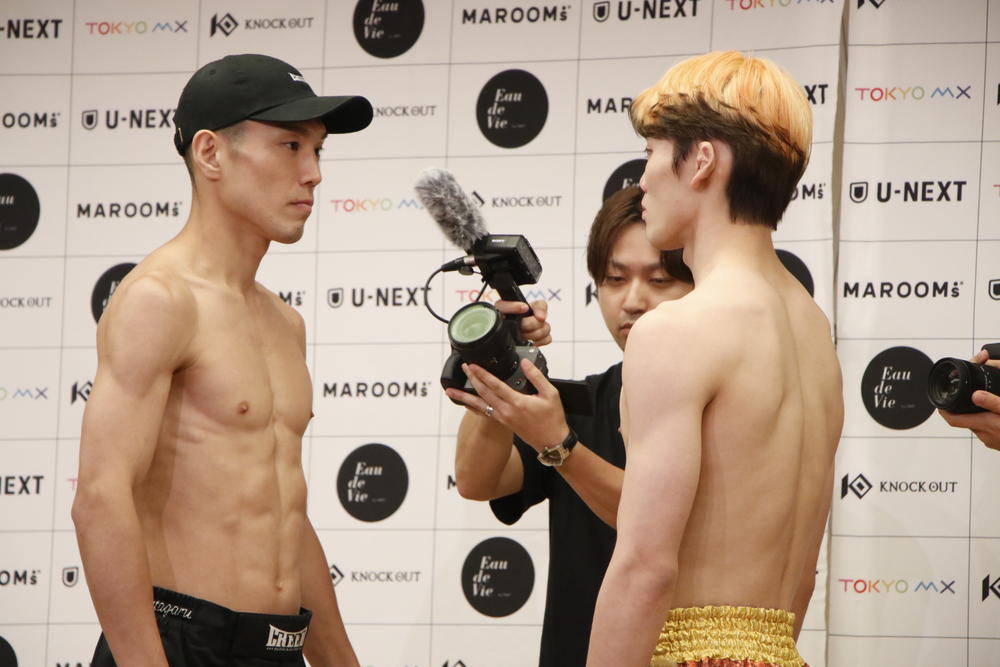 2025年7月20日(日)東京・後楽園ホール『MAROOMS presents KNOCK OUT.55』(U-NEXT配信)の前日公開計量&記者会見が、19日(土)都内にて13:30より行われた。  第5試合のKNOCK OUT-BLACKライト級3分3R延長1Rで対戦する、大谷翔司(KNOCK OUT クロスポイント渋谷)は62.45kg、木村涼仁(Bellus Gym)は62.3kgでそれ
