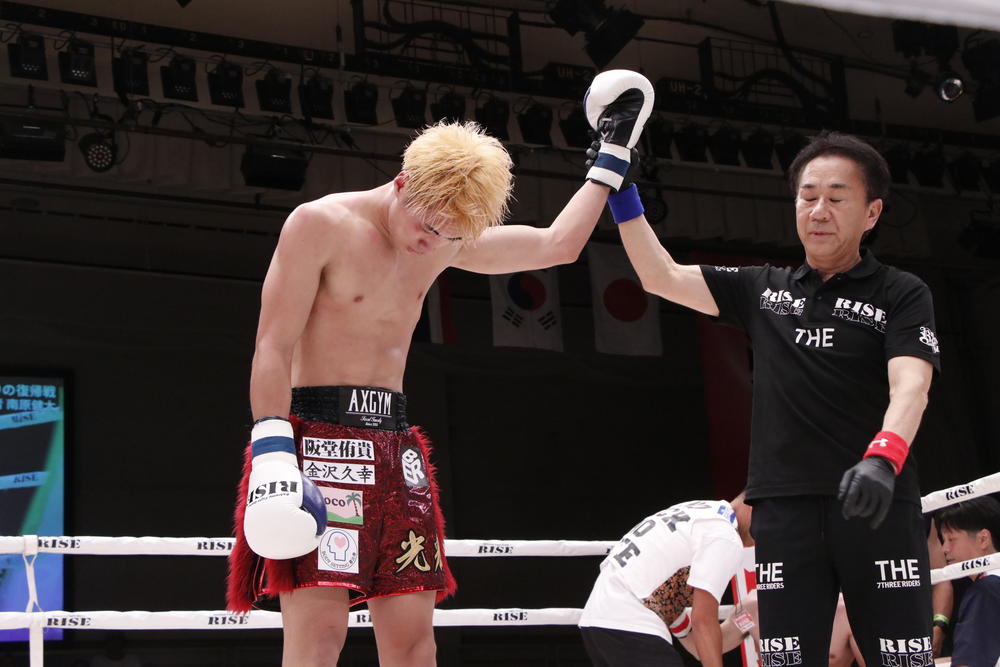 【RISE】ダウン奪われた南原健太が猛烈追い上げで延長戦で逆転勝利、シンパヤックがダウン奪い實方拓海に判定勝ち、平岡琴が粘る辻井和花を延長戦で振り切り決勝へ、田中佑樹がTETSUを圧倒初回KO「YA-MANさんとやりたいって選手を一人ずつ倒していく」、奥村将真が鮮やかアッパーでKO勝ち、杉本祥が亡き師匠に捧げるKO勝ち、前半戦は4試合がKO決着