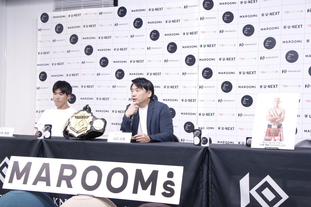 2025年9月23日(火・祝)東京・後楽園ホール『MAROOMS presents KNOCK OUT.57』の対戦カード発表記者会見が、7月29日(火)都内にて行われた。  今大会では3つのタイトルマッチが行われる。KNOCK OUT-BLACKフェザー級王座決定戦3分3R延長1Rでは、古木誠也(REX GYM)とチュームーシーフー(中国/郭強ファイトクラブ/CFP)が対戦。  古木はフルコン