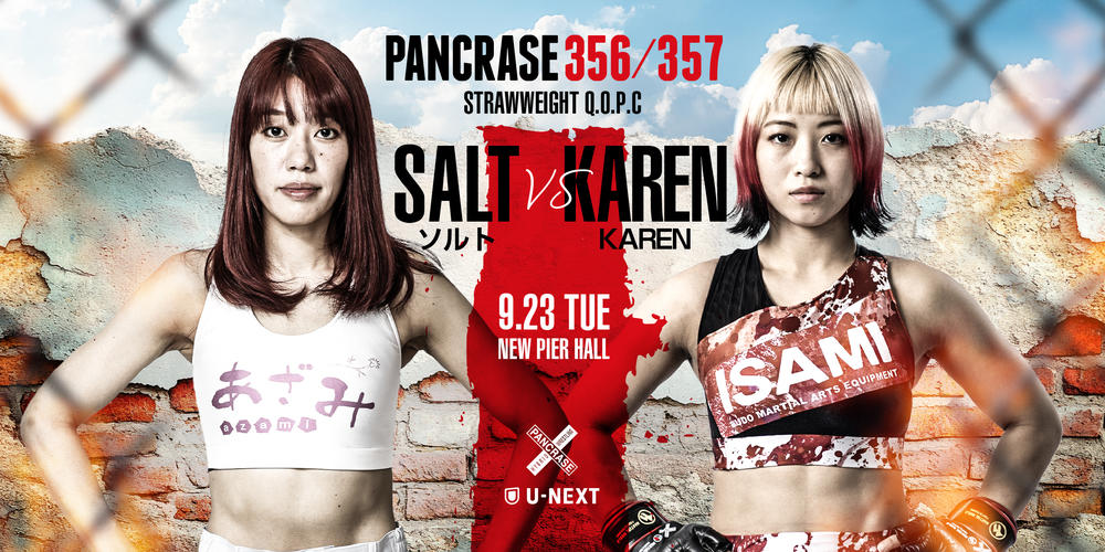 2025年9月23日(火/祝)東京・ニューピアホールで開催される『PANCRASE 356/357』(U-NEXT配信)の14カードが下記の通り発表された。  女子ストロー級チャンピオンシップ(5分5R)として、王者ソルト(マルスジム)に、同級1位のKAREN(THE BLACKBELT JAPAN)が挑戦する。 ▼クイーン・オブ・パンクラス・チャンピオンシップ ストロー級 5分5Rソルト(マル