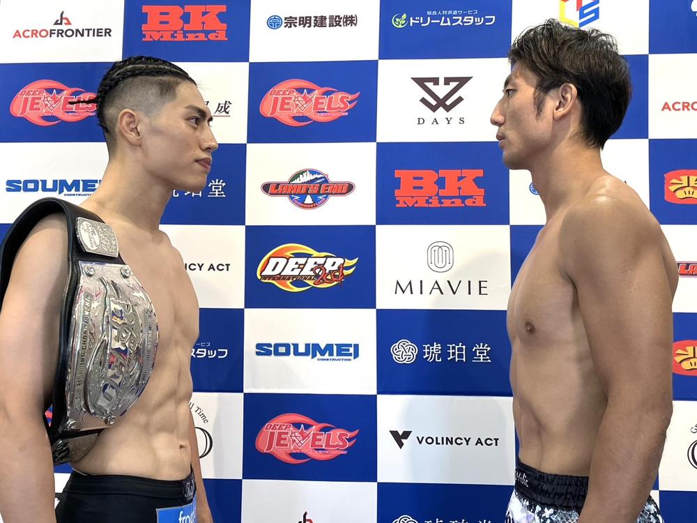 【DEEP】ウェルター級王者・角野晃平 「今後の格闘技人生において大事な試合」、挑戦者・嶋田伊吹「何が何でも勝ちます」=全選手が計量パス