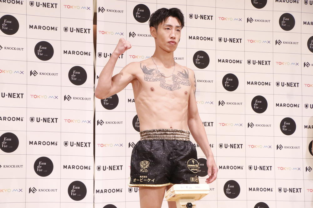 2025年9月23日(火・祝)東京・後楽園ホール『MAROOMS presents KNOCK OUT.57』(U-NEXT配信)の前日公開計量&記者会見が、22日(月)都内にて13:30より行われた。  セミファイナル(第11試合)のKNOCK OUT-BLACKスーパーバンタム級王座決定戦3分3R延長1Rで対戦する、森岡悠樹(北流会君津ジム)は54.9kg、福田拓海(KNOCK OUTクロス