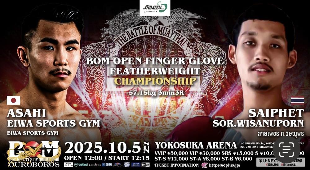 2025年10月5日(日)神奈川・横須賀アリーナ『Shimizu presents BOM OUROBOROS 2025』(U-NEXT配信)の追加対戦カードと一部対戦カードの変更が発表された。  現在、脅威の39連勝中で11月のONE日本大会では、新設されるONEアトム級ムエタイ初代世界王座決定戦に臨む名高・エイワスポーツジム(=吉成名高/エイワスポーツジム)が出場、ダウサヤーム・ウォーワンチ