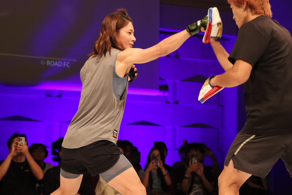 50kg契約5分3Rでイ・ボミ(韓国/SSMA上昇道場)と対戦するケイト・ロータス(フリー)は、1分半のミット打ちでサウスポーからのジャブ、ジャブの連打、左ストレート、ワンツーなどステップインしてのパン