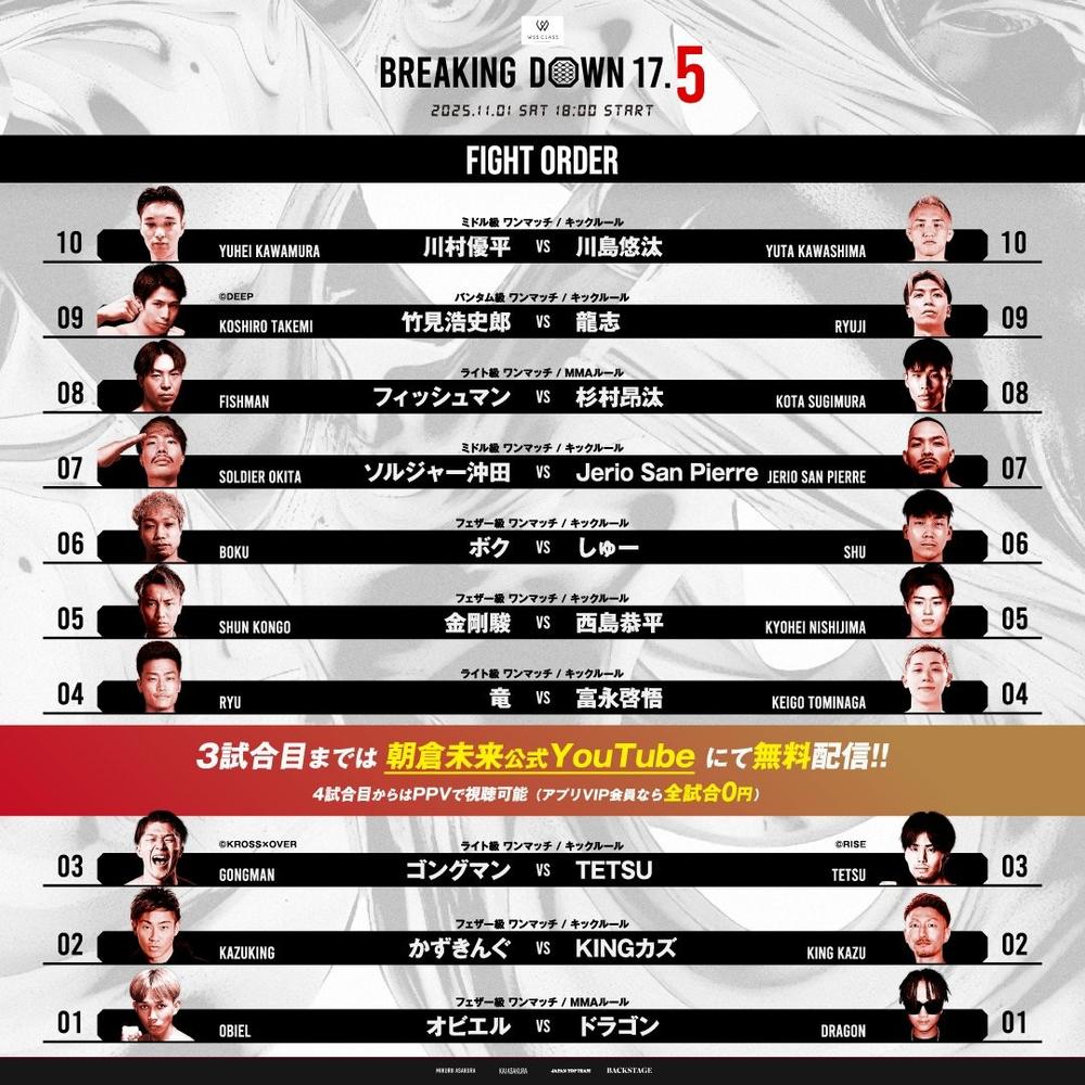 2025年11月1日(土)都内某所で開催される『BreakingDown 17.5』の対戦カードが、朝倉未来のYouTubeチャンネルにて発表された。