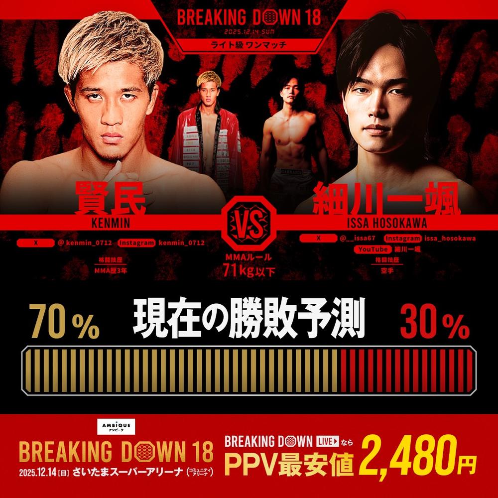 2025年12月14日(日)さいたまスーパーアリーナ コミュティアリーナ『BreakingDown 18』の、ファンによる勝敗予想の途中経過が12日に公式SNSにて公開された。  今大会の目玉である「中国vs.BreakingDown対抗戦 5vs.5」は、朝倉未来BreakingDown CEOが「相手の中国の選手はめちゃめちゃ強いですからね。こっちももう最高戦力で行きますんで。これで負けたら