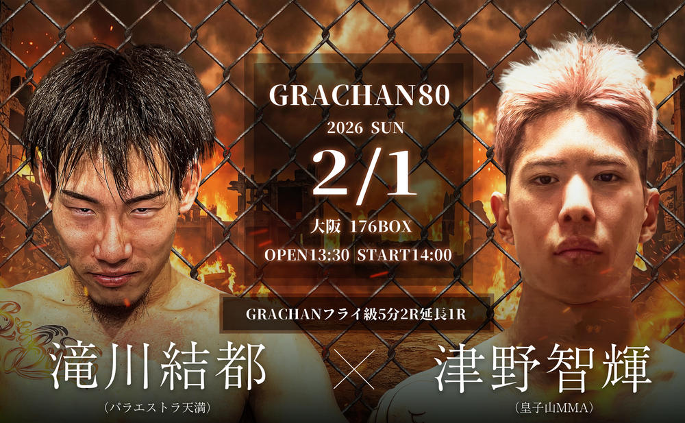 2026年2月1日(日)大阪・176BOXで開催される『GRACHAN 80』の全対戦カードが、21日の『GRACHAN79×HELIOSⅡ』の大会中に発表された。  80回記念大会となる同大会のメインは、第4代GRACHANフライ級王者・小田魁斗(CARPE DIEM福岡)の初防衛戦。同級1位の小林大介(ALIVE)が挑戦する。 ▼GRACHANフライ級タイトルマッチ 5分3R小田魁斗(CAR