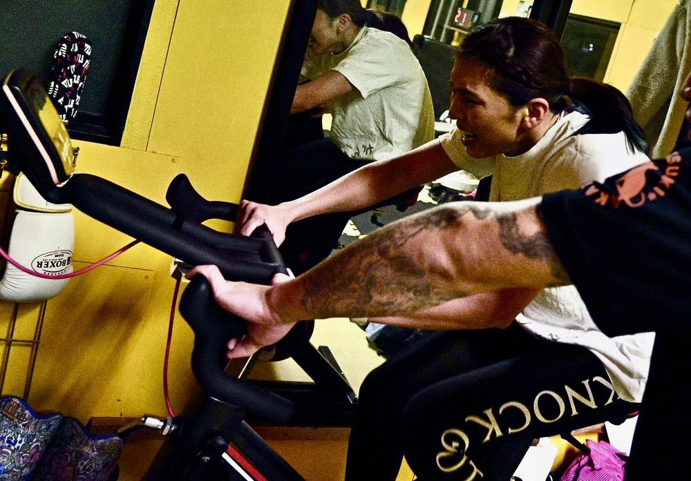 この日の公開練習ではミット打ちではなく、世界中のトップアスリートが使用している「インドアバイク」を使用した練習を
