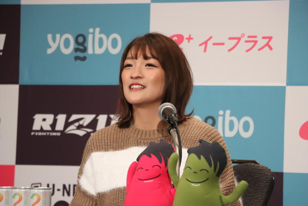 第10試合のRIZINスーパーアトム級(49.0kg)タイトルマッチ5分3Rで、王者・伊澤星花(Roys GYM/JAPAN TOP TEAM)に挑戦するRENA(SHOOTBOXING/シーザージム)が出席。試合への意気込みを語った。